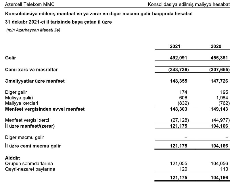 "Azercell Telekom"un ödədiyi mənfəət vergisi 44 milyon 977 min manatdan (2020-ci il) 27 milyon 128 min manata (2021-ci il) düşüb.