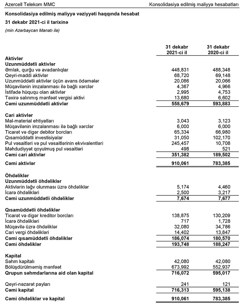 2020-ci illə müqayisədə 2021-ci ildə "Azercell Telekom" şirkətinin cəmi aktivləri 126 milyon 676 min manat və ya 16,2% artaraq 910 milyon 61 min manata çatıb.