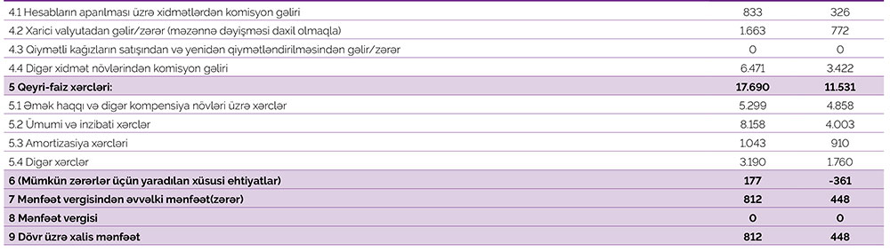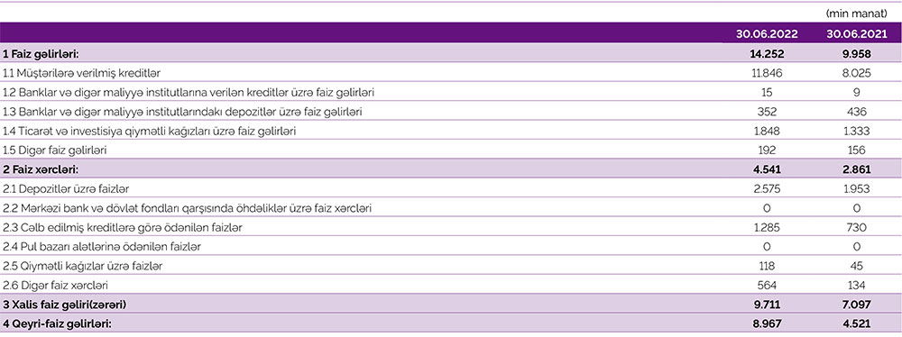 Müqayisə olunan dövrdə "Azər-Türk Bank"ın faiz gəlirləri 4 milyon 294 min manat və ya 43,1% artaraq 14 milyon 252 min manat, qeyri-faiz gəlirləri isə 4 milyon 446 min manat və ya 98,3% artaraq 8 milyon 967 min manat təşkil edib.