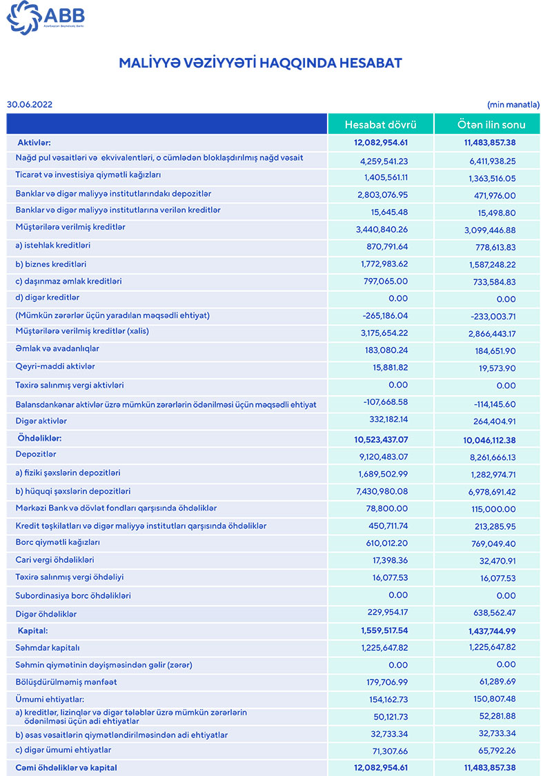 2022-ci ilin 1-ci yarısında “ABB” ASC-nin cəmi aktivləri 12 milyard manat səviyyəsini də keçib. Ötən ilin sonu ilə müqayisədə Bankın cəmi aktivləri 599 milyon 97 min manat və ya 5,2% artaraq 30 iyun 2022-ci il tarixində 12 milyard 82 milyon 954 min manat təşkil edib.