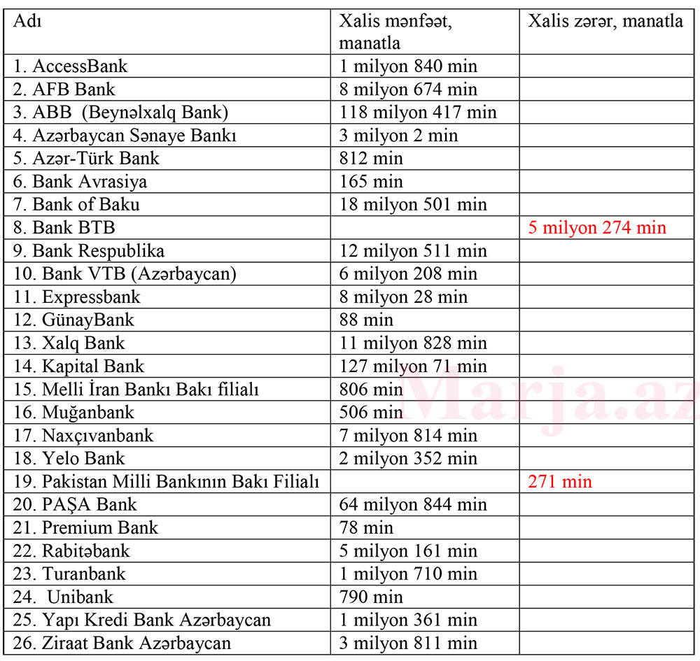 “Marja.az”ın araşdırmasına görə, 2022-ci ilin birinci yarısını banklardan 24-ü xalis mənfəət, 2-si xalis zərər ilə başa vurub.