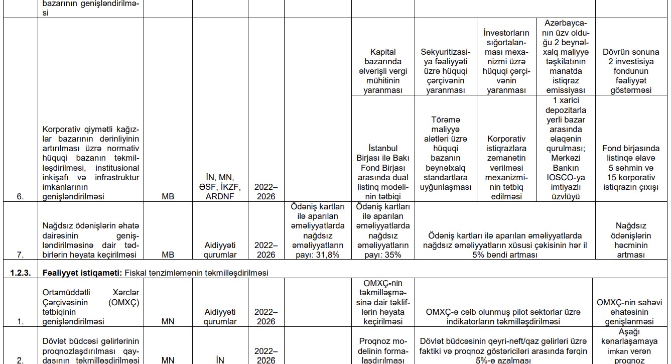 2023-2025-ci illər ərzində, bankların cəmi kredit portfelinin həcminin hər il 10%, biznes kreditlərinin həcminin hər il 6%, mikro, kiçik, orta biznesə verilmiş kreditlərin həcminin hər il 15% artırlması hədəflənir.
