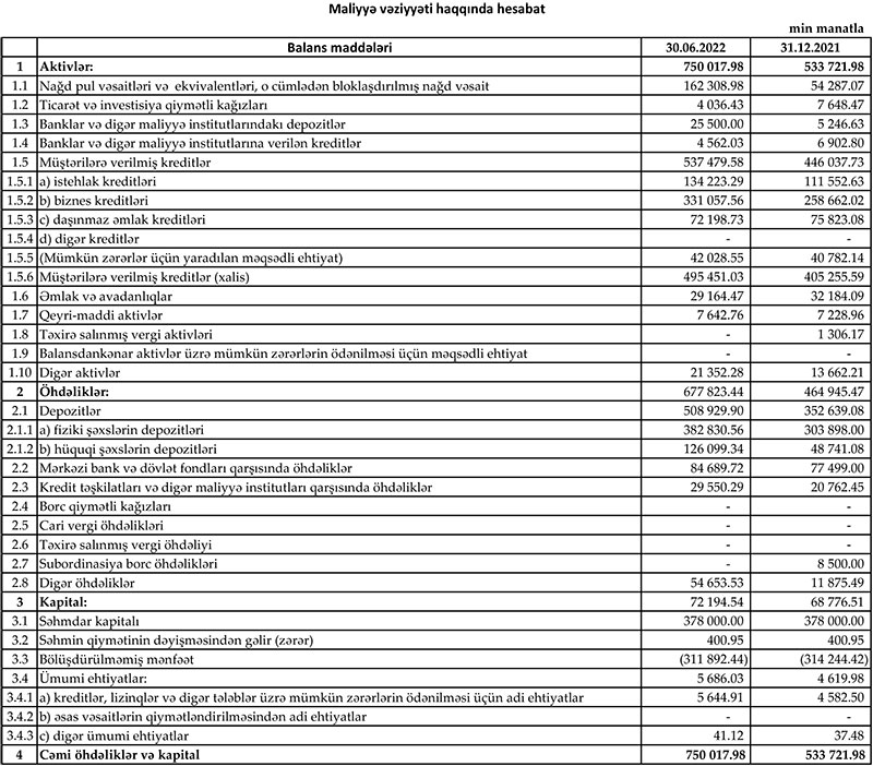 30 iyun 2022-ci il tarixində "Yelo Bank" 91 milyon 752 min manat məcmu kapitala malik olub.