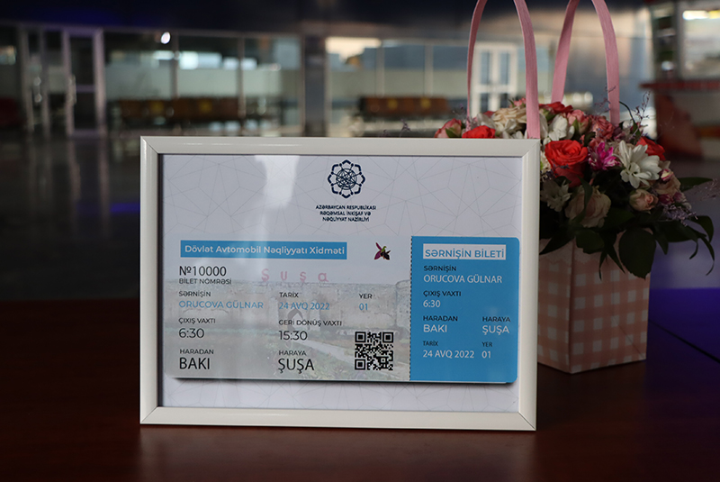 Dövlət Avtomobil Nəqliyyatı Xidmətinin rəisi Anar Rzayev təntənəli yolasalma mərasimində Gülnar Orucovaya “10000-ci sərnişin sertifikatı” və hədiyyə təqdim edib. Xidmət rəisi bildirib ki, işğaldan azad olunmuş ərazilərə 24 yanvar 2022-ci il tarixindən etibarən həyata keçirilən səfərlərə maraq olduqca böyükdür. “Bu günədək müəyyən edilmiş istiqamətlər üzrə 312 reys həyata keçirilib, 13069 nəfər Şuşa, Ağdam və Füzuli şəhərlərini ziyarət edib. Bu gün isə Şuşaya 10000-ci sərnişini yola salırıq”, – deyə Anar Rzayev vurğulayıb.
