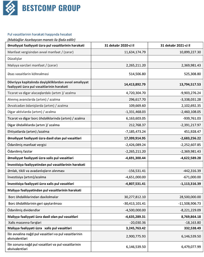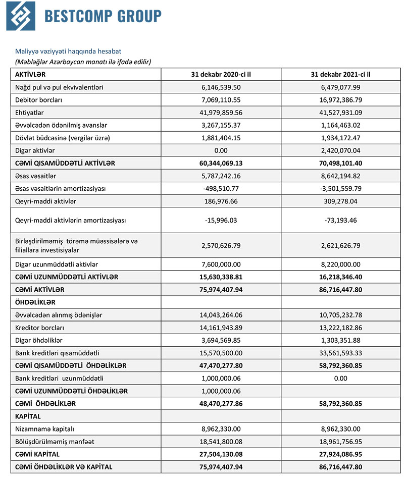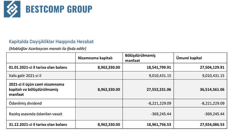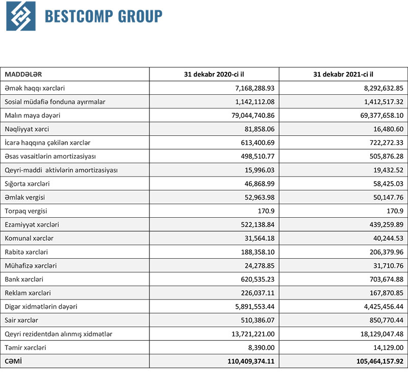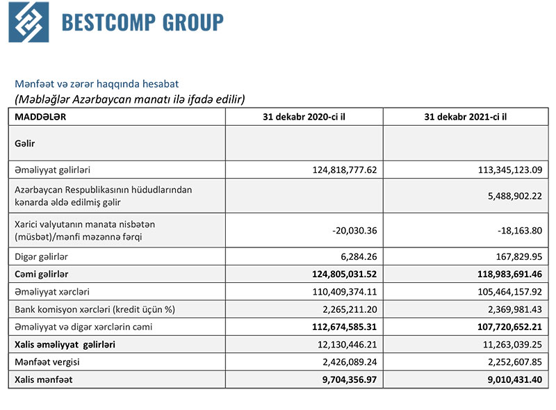 “Bestcomp Group” 2021-ci ili 9 milyon 10 min manat xalis mənfəət ilə başa vurub. Şirkət 2020-ci ili 9 milyon 704 min manat xalis mənfəət ilə bağlamışdı (ötən il xalis mənfəəti 7,2% azalıb).