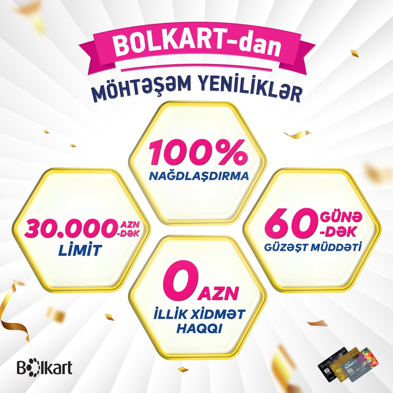 - Əvvəlki şərtlər öncəki illərdə kart müştərilərinin davranışlarına və risk kateqoriyalarına əsaslanmışdır. Lakin bu gün artıq siz də bildirdiyiniz kimi kredit kart müştərilərinin sayı artmış, onların davranışları və kartdan istifadələri təhlil edilərək, müştərilərə daha yaxın olmaq üçün şərtlər yenilənmişdir. Yenilədiyimiz şərtlərdən biri də bütün növ Bolkart kredit kartlarının balansının 100% həcimdə Nağdlaşdırma imkanın olması oldu. Belə ki, əvvəlki şərtlərdə bu yalnız yuxarı əmək haqqı alan seqment müştəriləri üçün mümkün idi. Bundan sonra isə bütün növ Bolkart kredit kartı müştərilərimizdə 100% Nağdlaşdırma imkanı olacaqdır.