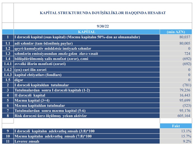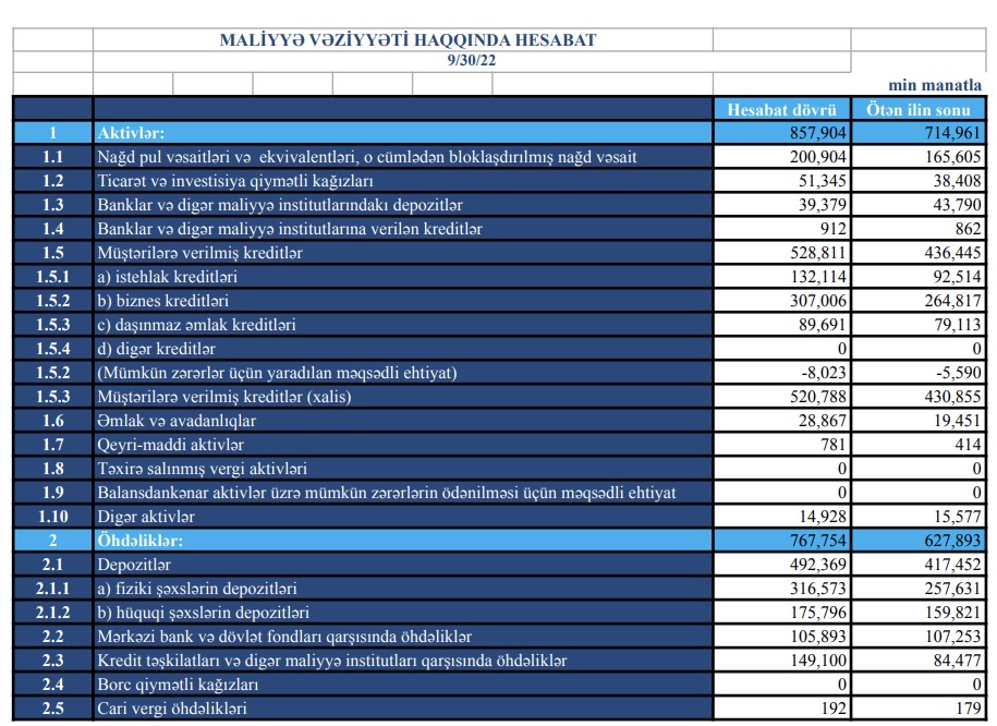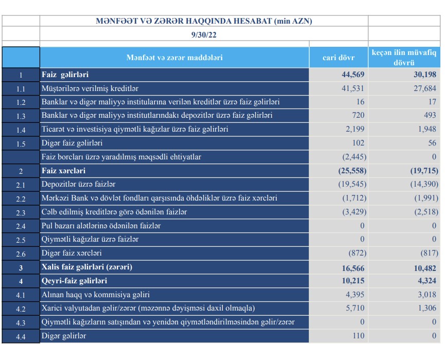 Bank 2022-ci ilin 9 ayını 2,1 milyon manat mənfəətlə başa vurubBu il fəaliyyətinin 30-cu ildönümünü qeyd edən, ölkənin aparıcı banklarından biri olan "TuranBank" ASC 2022-ci ilin III rübünün maliyyə göstəriciləri üzrə bazar mövqeyini qoruyub saxlamışdır.
