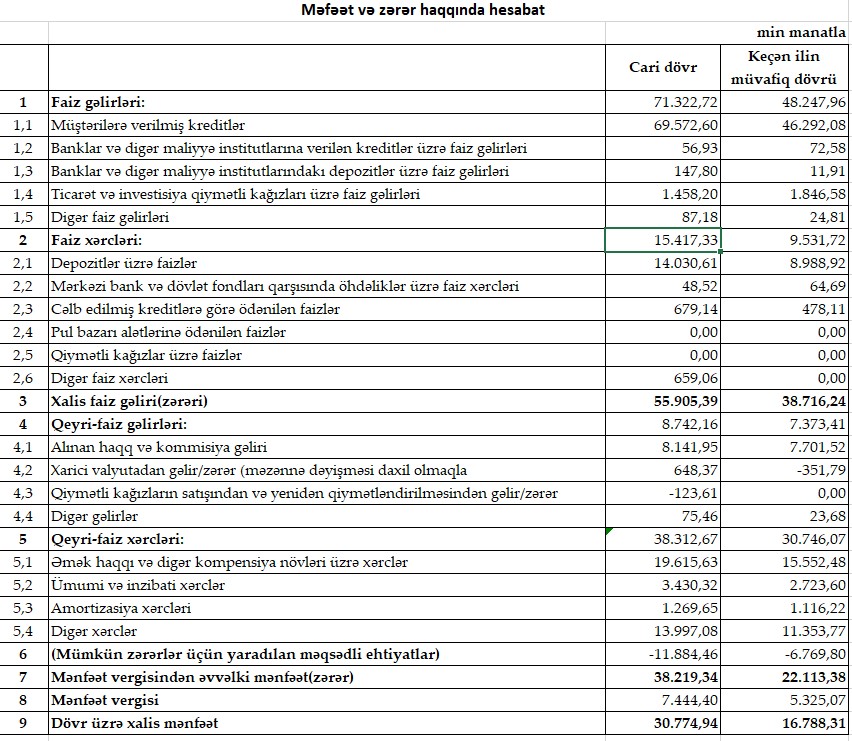 Müqayisə üçün qeyd edək ki, 2021-ci ilin 9 ayında "Bank of Baku"nın cəmi əməliyyat gəlirləri 55 milyon 621 min manat, cəmi əməliyyat xərcləri 40 milyon 278 min manat, gəlirlər xərcləri üstələdiyindən əməliyyat mənfəəti 15 milyon 343 min manat təşkil etmişdi. Eyni zamanda, mümkün zərərlər üçün yaradılan məqsədli ehtiyatlardan qayıdan 6 milyon 770 min manatın hesabına mənfəət 22 milyon 113 min manata yüksəlmişdi. "Bank of Baku" mənfəətindən 5 milyon 325 min manat mənfəət vergisi ödəmişdi.