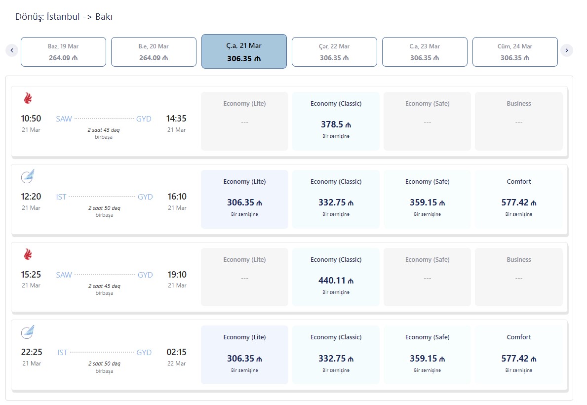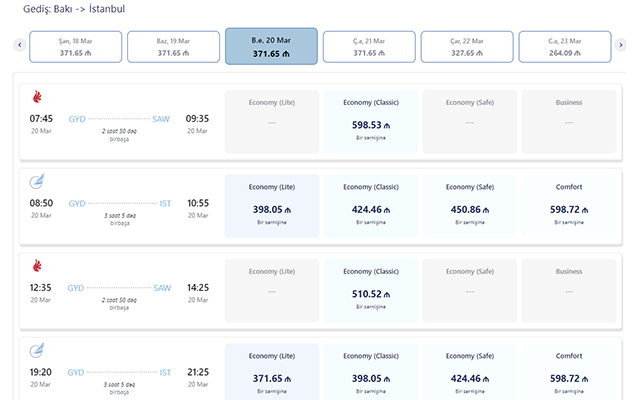 Mart ayının 20-21-i tarixlərinə AZAL-la Bakıdan İstanbula (İstanbul Hava Limanı) təyyarə biletinin qiyməti ekonom “lite” tarifi ilə 371.65 AZN, “klassik” tarifi üçün 398.05 AZN, “safe” tarifi üçün isə 424.46 AZN təşkil edir.