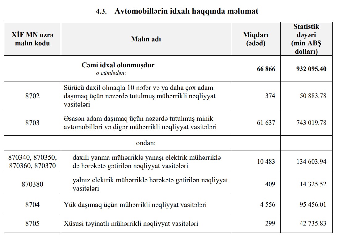 2022-ci ilin 11 ayında (yanvar-noyabr) Azərbaycana 932 milyon 95 min dollar dəyərində 66 min 866 ədəd avtomobil (nəqliyyat vasitələri) idxal edilib.