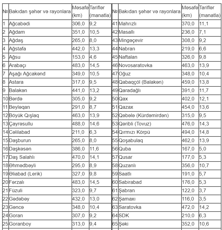 Bu tariflər şəhər və rayonlardan Bakı istiqamətinə də şamil edilir.