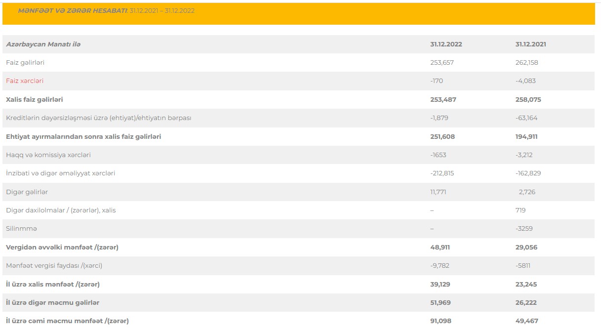 Marja xəbər verir ki, təşkilatın 2021-ci ildə 262 min manat təşkil etmiş faiz gəlirləri, 2022-ci ildə 254 min manata düşüb. Eyni zamanda, ötən il "Qafqaz-Kredit" 12 manat digər gəlirlər əldə edib.