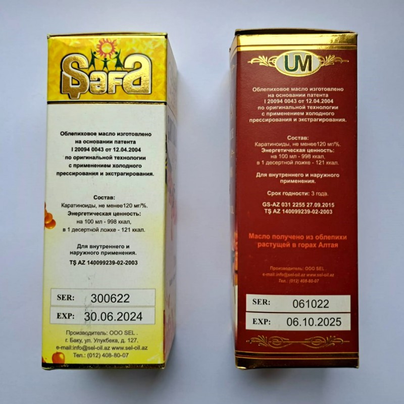 Baxış zamanı “SEL” MMC tərəfindən istehsal olunan “UM” və “Şəfa” əmtəə nişanlı bitki mənşəli çaytikanı yağının qablaşdırılmasında həqiqətə uyğun olmayan məlumatların göstərildiyi, məhsulun saxlanma müddətinin normativ sənəddə 12 ay göstərilməsinə baxmayaraq etiket məlumatında 3 il qeyd olunduğu, eyni zamanda məhsulun istifadə təlimatları haqqında məlumatların qeyd olunduğu içlik vərəqələri ilə təmin edilmədiyi məlum olub.