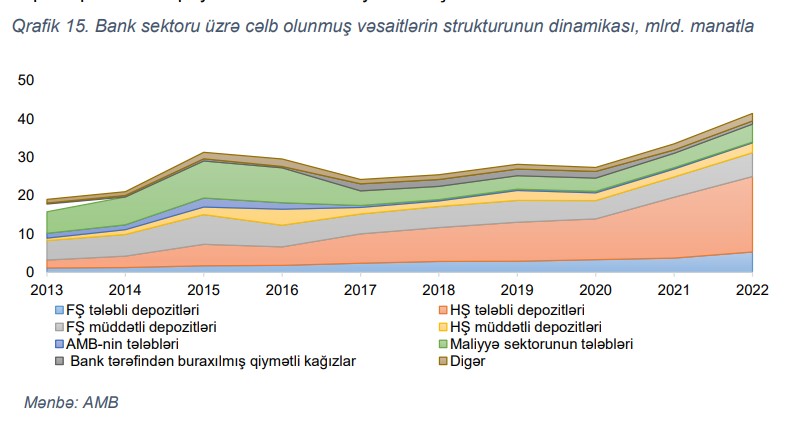 manat), müddətli depozitləri isə 16% (0.9 mlrd. manat) artmışdır. İl ərzində fiziki şəxslərin nağdsız əməliyyatlarının yüksək dinamikası, o cümlədən debet kartları ilə əməliyyatların artımı tələbli depozitlərin artımını dəstəkləyən amil kimi çıxış etmişdir. Hazırda, fiziki şəxslərin depozitləri bankların öhdəliklərinin 27.7%-ni təşkil edir. 2021-ci illə müqayisədə xarici valyutada olan depozitlərin həcmində azalan trend davam etmişdir. Belə ki, il ərzində fiziki şəxslərin depozitlərinin dollarlaşma səviyyəsi 1.9 f.b. azalaraq 39.8% təşkil etmişdir. Fiziki şəxslərin müddətli depozitlərinin dollarlaşma səviyyəsində əhəmiyyətli azalma (il ərzində 5.6 f. b. azalaraq 39%-ə enib) müşahidə edilmişdir ki, bu da əhalinin maliyyə sisteminə və milli valyutaya inamının artması kimi qiymətləndirilə bilər.