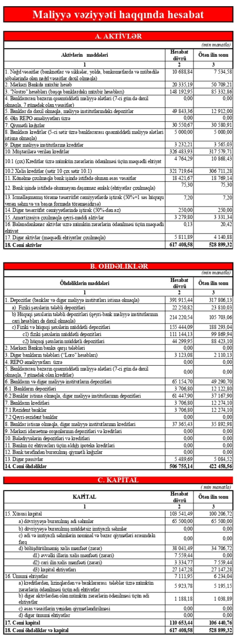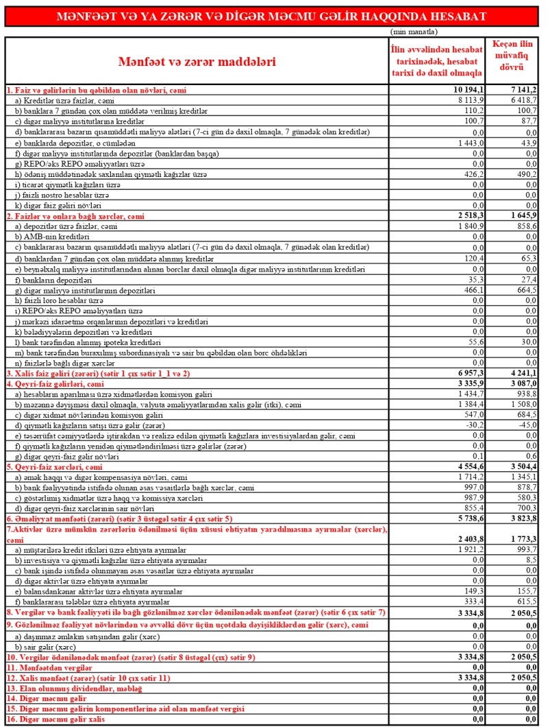 Bank ilk rübü 3 milyon 335 min manat xalis mənfəət ilə başa vurub.