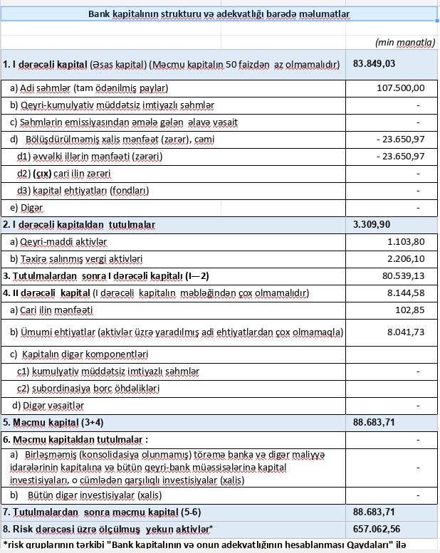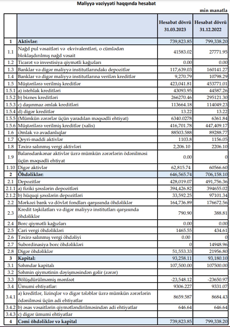 Ötən ilin analoji dövrü ilə müqayisədə Bankın cəmi aktivləri əhəmiyyətli dərəcədə  olmaqla, 11,65% artımla 739,82 milyon manat təşkil edib. bankın cəmi depozit portfelində də 31,51% artım qeydə alınaraq 428,02 milyon manata çatıb.