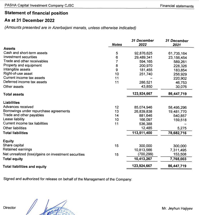 "PAŞA Kapital İnvestisiya Şirkəti"nin cəmi aktivləri 2022-ci ildə 2021-ci ilin sonu ilə müqayisədə 37 milyon 478 min manat və ya 43,3% arataraq 123 milyon 215 min manata çatıb. İnvestisiya şirkəti 2021-ci ilin sonunda 86 milyon 448 min manat cəmi aktivlərə malik idi.