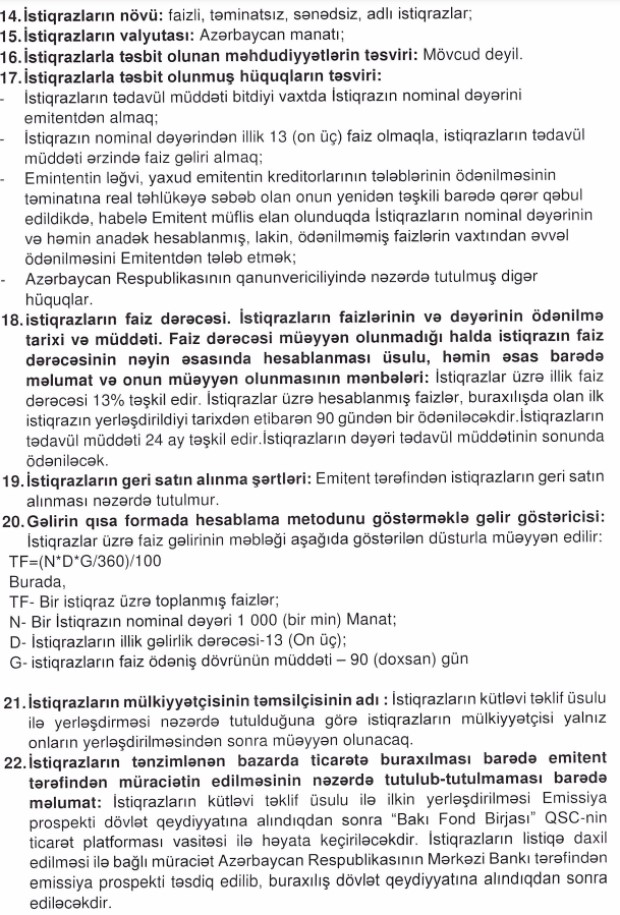 Faizli, təminatsız, sənədsiz, adlı istiqrazlar üzrə faiz dərəcəsi illik 13%-dir. İstiqrazlıarın tədavül müddəti 24 aydır. Faizlər hər 90 gündən bir ödəniləcəkdir.