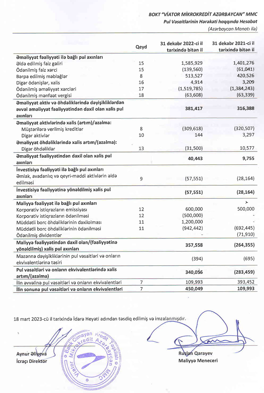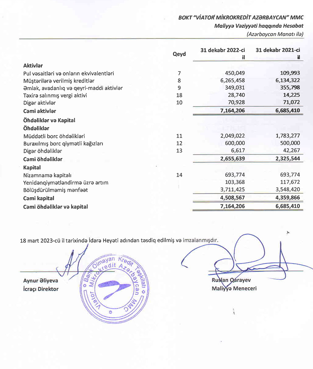 BOKT "Viator Mikrokredit Azərbaycan" MMC-nin 2022 - ci ilin sonuna olan maliyyə və audit hesabatı