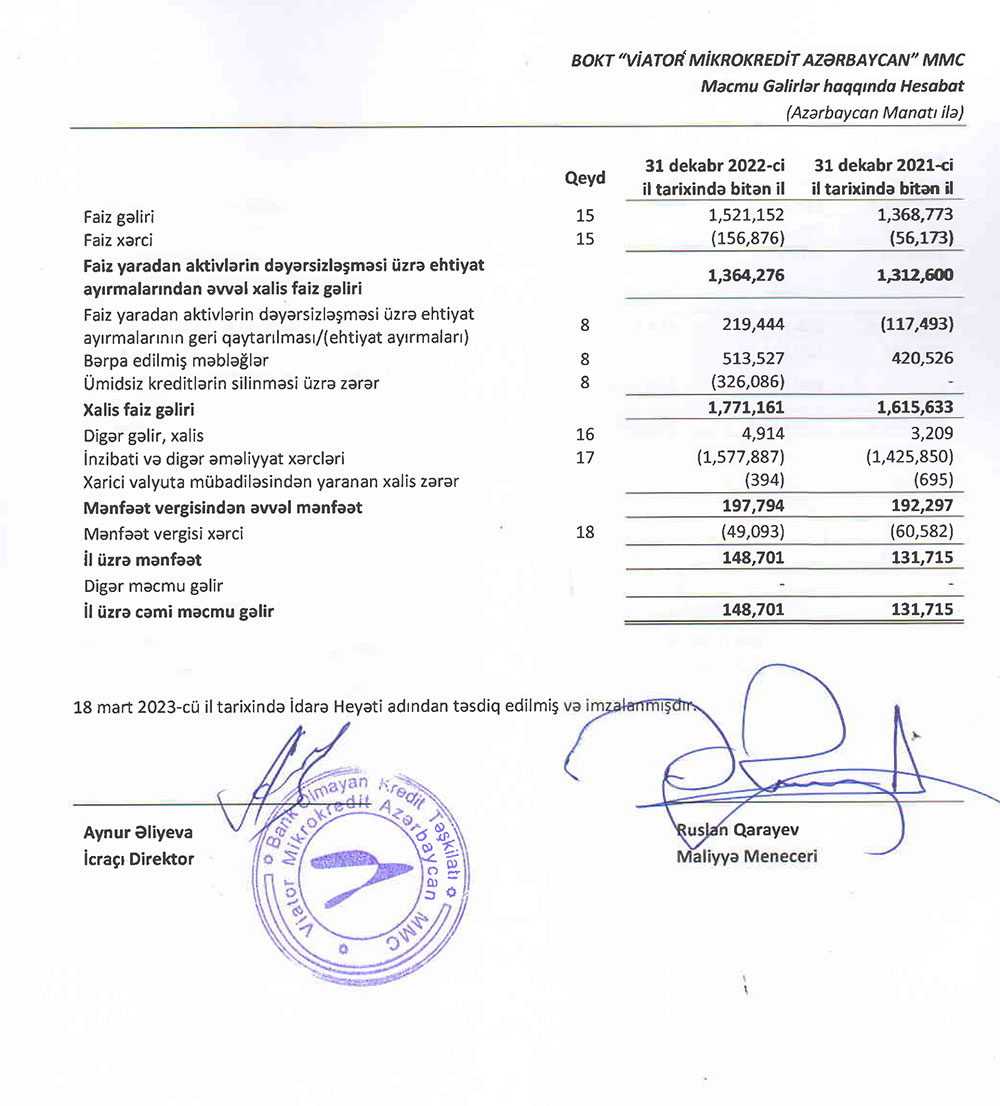 BOKT "Viator Mikrokredit Azərbaycan"ın gəlirləri və mənfəəti artıb - 2022-Cİ İLİN HESABATI