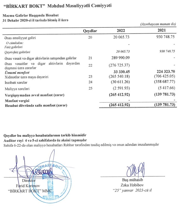 Əsas vəsaitlər və digər aktivlərin dəyərdən düşməsi üzrə zərər, inzibati və əməliyyat xərcləri ilə əlaqədar olaraq "BirKart BOKT" MMC 2022-ci ili 265 min 413 manat xalis zərər ilə bağlayıb.