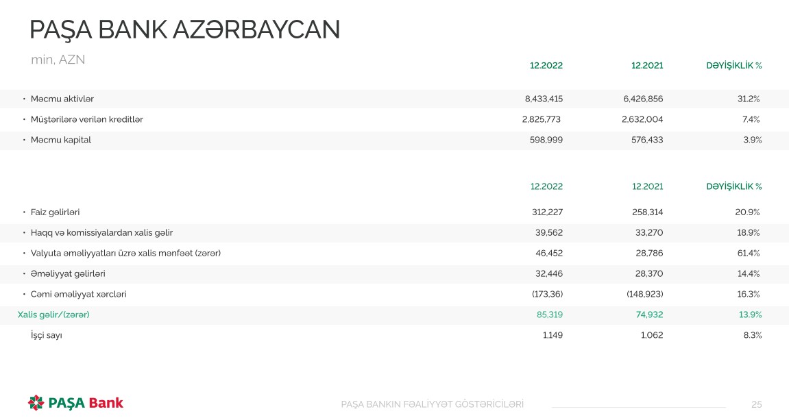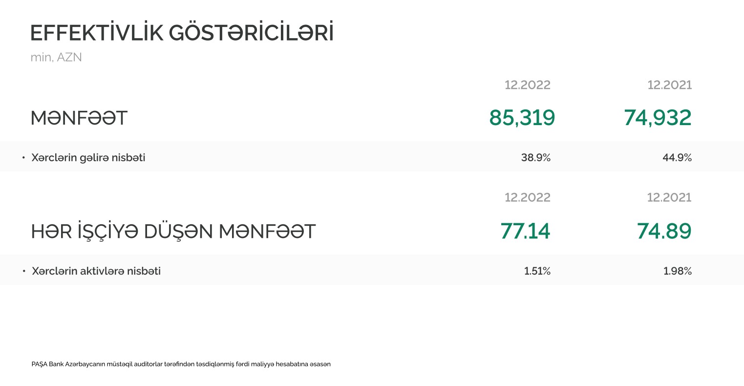 Müstəqil auditorlar tərəfindən təsdiqlənmiş maliyyə hesabatına əsasən, "PAŞA Bank Azərbaycan" 2022-ci ili 85 milyon 319 min manat xalis mənfəət ilə başa vurub. Bank 2021-ci ili 74 milyon 932 min manat xalis mənfəət ilə bağlamışdı.