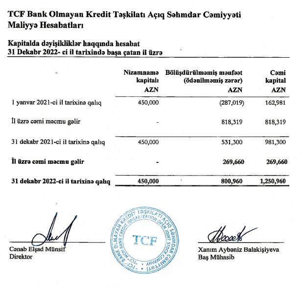 "TCF Bank Olmayan Kredit Təşkilatı" ASC 2022-ci ili 270 min manat xalis mənfəət ilə başa vurub. Təşkilat 2021-ci ili 818 min manat xalis mənfəət ilə bağlamışdı. Beləliklə, "TCF BOKT"ın xalis mənfəəti 2022-ci ildə 2021-ci illə müqayisədə 67% azalıb. Ötən il, təşkilatın gəlirlərindəki artımı maliyyə aktivlərinin dəyərsizləşməsi üzrə ehtiyata ayırma, faiz, ümumi, inzibati və mənfəəti vergisi xərclərinin artması silib.