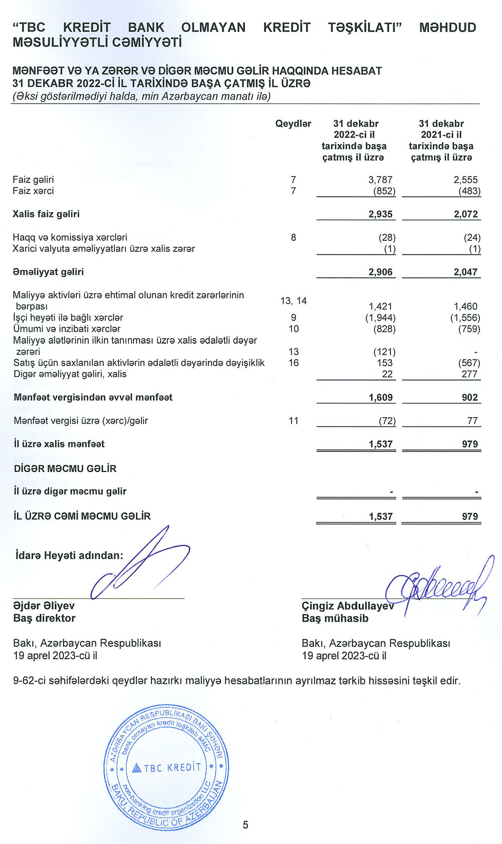 "TBC Kredit Bank Olmayan Kredit Təşkilatı" MMC-nin 31 dekabr 2022-ci il tarixində başa çatmış il üzrə Maliyyə Hesabatlarının Beynəlxalq Standartlarına uyğun hazırlanmış Maliyyə Hesabatları.
