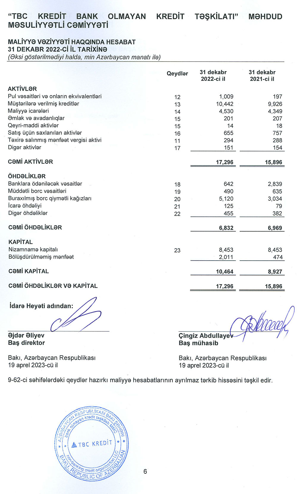 "TBC Kredit Bank Olmayan Kredit Təşkilatı" MMC-nin 2022-ci il üzrə maliyyə hesabatları