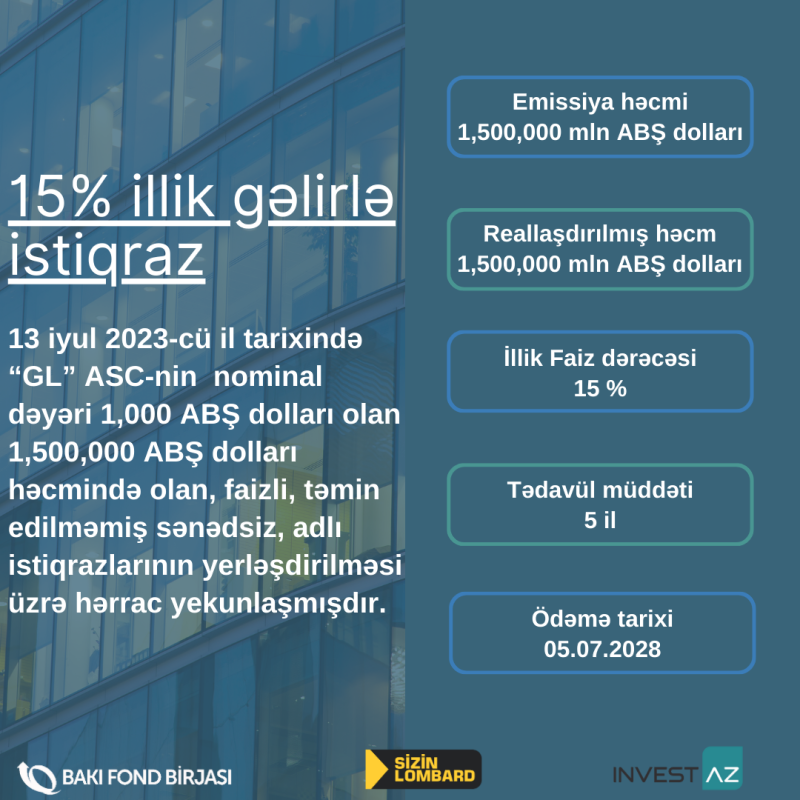 13 iyul 2023-cü il tarixində Bakı Fond Birjasında “GL” ASC-nin tədavül müddəti 5 təqvim ili, nominal dəyəri 1,000 ABŞ dolları olan AZ2010020280 dövlət qeydiyyat nömrəli, 1,500,000 (bir milyon beş yüz min ) ABŞ dolları həcmində olan, faizli, təmin edilməmiş sənədsiz, adlı istiqrazlarının yerləşdirilməsi üzrə hərrac yekunlaşmışdır.