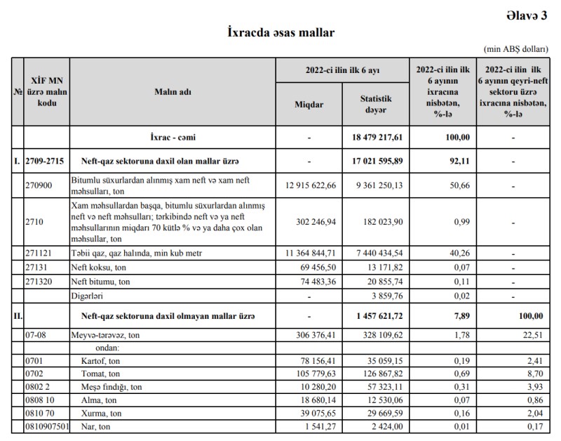 Müqayisə üçün qeyd edək ki, 2022-ci ilin ilk 6 ayı ərzində Azərbaycandan 17 milyard 21 milyon 596 min dollarlıq neft-qaz sektoruna daxil olan mallar, o cümlədən 9 milyard 361 milyon 250 min dollarlıq xam neft, 7 milyard 440 milyon 434 min dollarlıq təbii qaz ixrac edilmişdi. Beləliklə, Azərbaycandan ixrac olunan xam neftin dəyəri azalıb, təbii qazın dəyəri isə artıb.