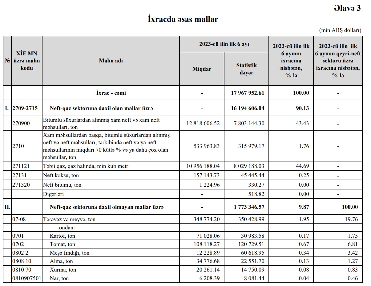 2023-cü ilin ilk 6 ayında Azərbaycanın ixracının dəyərinin 90.13%-ni neft-qaz sektoruna daxil olan mallar, 9,87%-ni neft-qaz sektoruna daxil olmayan mallar təşkil edib.