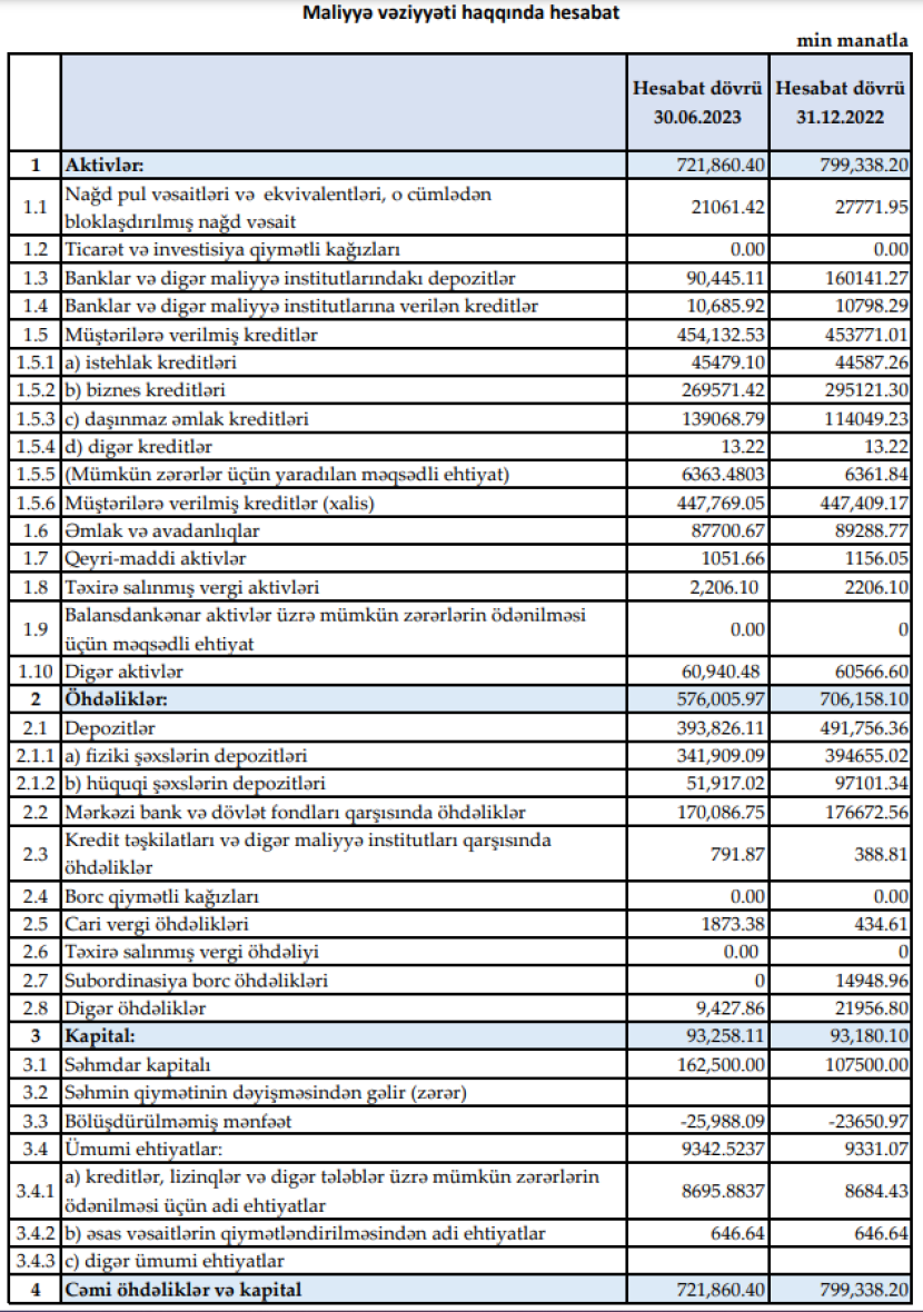 "Muğanbank" ASC 2023-cü ilin birinci yarısı (yanvar-iyun) üzrə maliyyə göstəricilərini açıqlayıb.