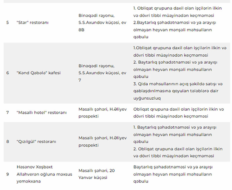 Agentlikdən verilən məlumata görə, bu müəssisələrdə qida təhlükəsizliyi qeydiyyatına dair çıxarışın olmaması ilə bağlı 3, obliqat qrupuna daxil olan işçilərin ilkin və dövri tibbi müayinədən keçirilməməsi ilə bağlı 8, baytarlıq şəhadətnaməsi və ya arayışı olmayan heyvan mənşəli məhsulların qəbulu ilə bağlı 6, qida məhsullarının açıq şəkildə satışı və qablaşdırılmasına qoyulan tələblərə dair uyğunsuzluq ilə bağlı 1 nöqsan aşkarlanıb. Aşkar edilmiş nöqsanların aradan qaldırılması ilə bağlı icrası məcburi göstərişlər verilib.