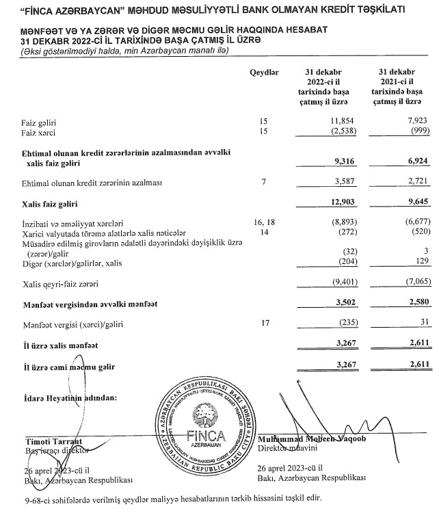 "Finca Azerbaijan" 2023-də də mənfəətlə fəaliyyət göstərir, kredit portfeli böyüyüb