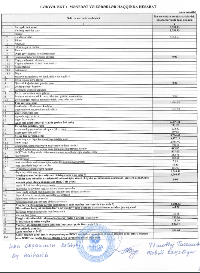 Marja.az Təşkilatın yarımillik hesabatına istinadən xəbər verir ki, 2023-cü ilin birinci yarısında "Finca Azerbaijan"ın faiz gəlirləri 8 milyon 52 min manat, qeyri-faiz gəlirləri 222 min manat, əməliyyat xərcləri çıxıldıqdan sonra əməliyyat mənfəəti 1 milyon 4 min manat təşkil edib. Təşkilat 118 min manat mənfəət vergisi ödəyib.