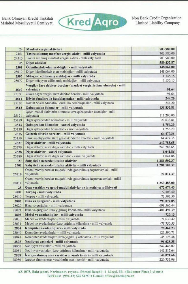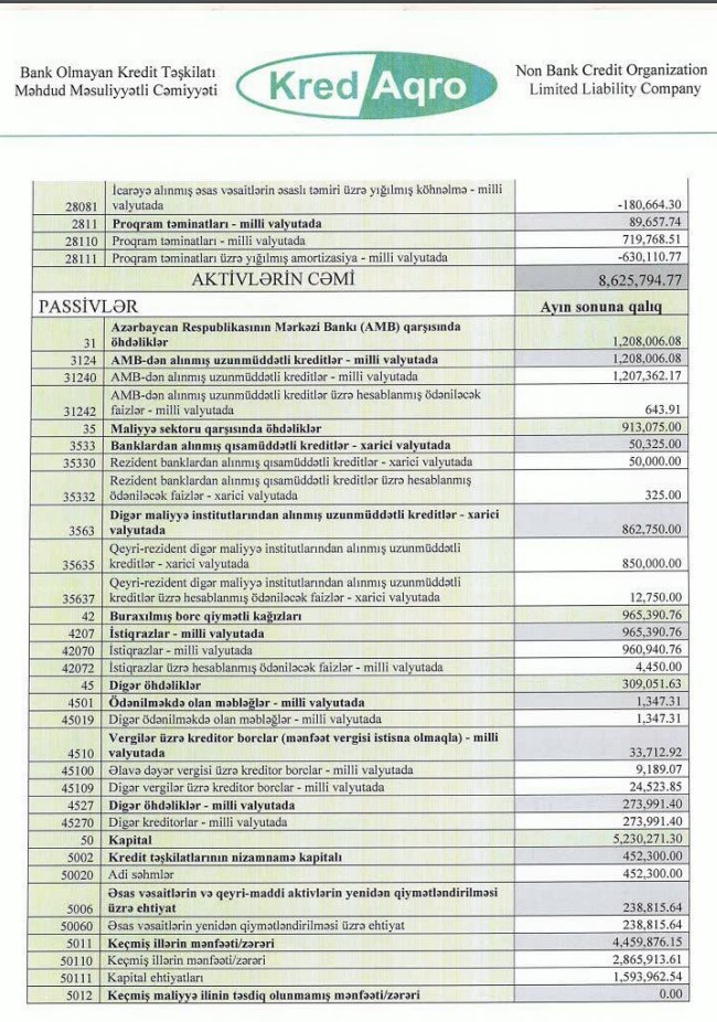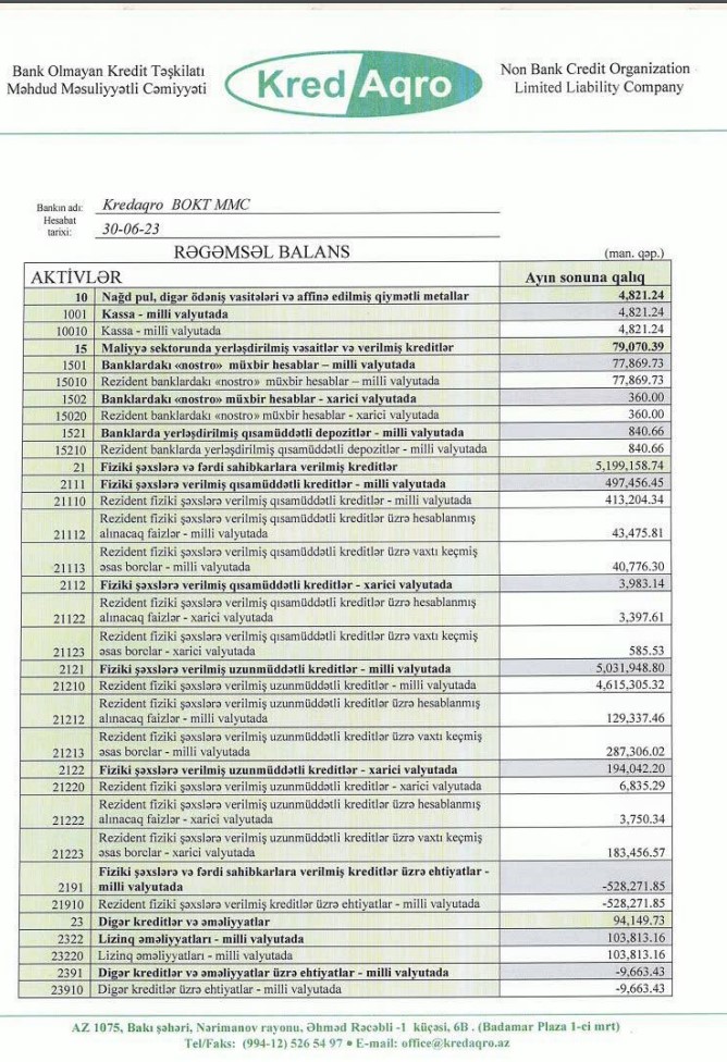 30 iyun 2023-ci il tarixində "KredAqro BOKT" 8 milyon 626 min manat cəmi aktivlərə malik olub.