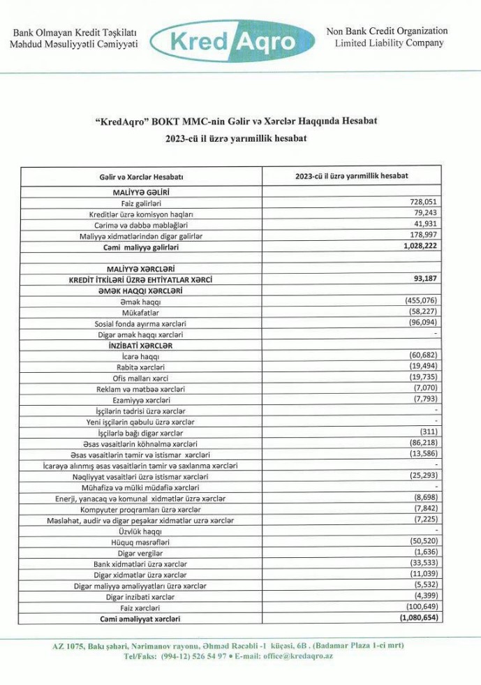 Marja.az Təşkilatın yarımillik hesabatına istindən xəbər verir ki, 2023-cü ilin ilk 6 ayı ərzində "KredAqro BOKT" ın cəmi maliyyə gəlirləri 1 milyon 28 min manat, o cümlədən faiz gəlirləri 728 min manat, qeyri-faiz gəlirləri 300 min manat təşkil edib.