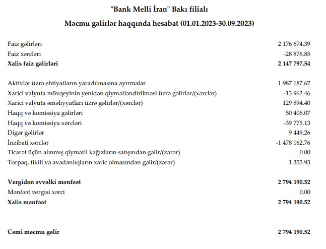 2023-cü ilin yanvar-sentyabr dövründə "Bank Melli İran" Bakı filialının cəmi aktivləri 17 milyon 34 min manat və ya 17% azalaraq 79 milyon 586 min manat düşüb. Geriləmə əsasən nağd pul vəsaitləri və digər banklardakı müxbir hesablardakı vəsaitlərin azalması ilə əlaədardır.