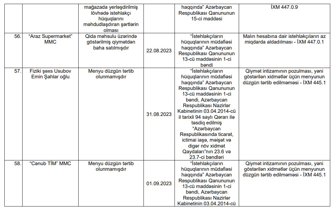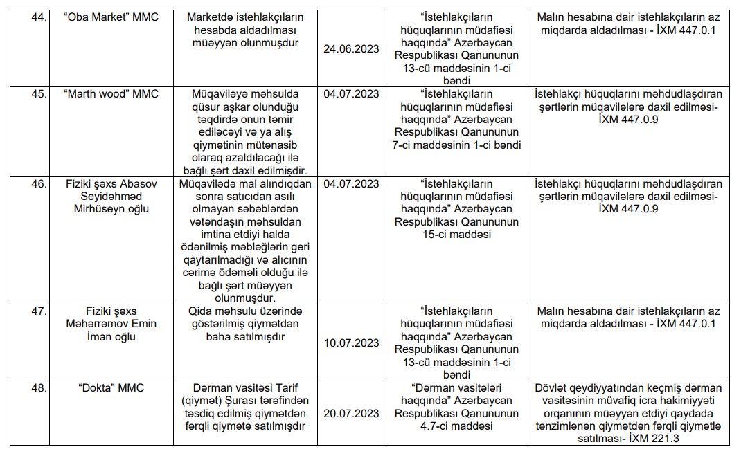 İstehlakçı hüquqlarının müdafiəsi və istehlak bazarına nəzarət sahəsində sahibkarlıq fəaliyyəti ilə məşğul olan fiziki və hüquqi şəxslər barədə tərtib olunmuş protokollara dair ətraflı məlumat: