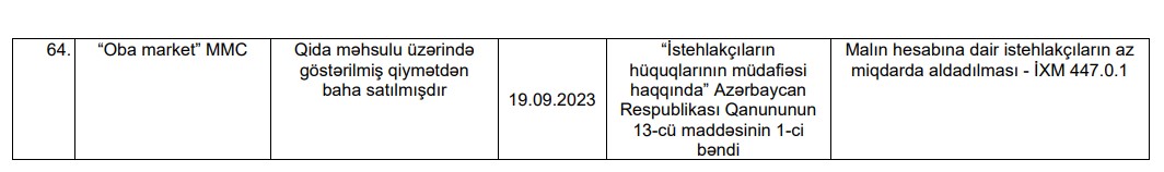 İnzibati xəta barədə protokollar 32 halda mal satan və ya əhaliyə xidmət göstərən şəxslər tərəfindən malın (xidmətin) ölçüsünə, çəkisinə, hesabına, habelə istehlak xüsusiyyətinə və ya keyfiyyətinə dair istehlakçıların az miqdarda aldadılması, 9 halda qanunvericilikdə nəzərdə tutulan hüquqlarla müqayisədə istehlakçının hüquqlarını məhdudlaşdıran şərtlərin müqaviləyə daxil edilməsi, 8 satılmış malların dəyişdirilməsi və ya geri qaytarılması qaydalarının pozulması, 6 halda istehlakçıların hüquqlarının və ya ticarət qaydalarının pozulmasının aradan qaldırılması haqqında istehlakçıların hüquqlarının müdafiəsini həyata keçirən müvafiq icra hakimiyyəti orqanının vəzifəli şəxslərinin qanuni yazılı tələblərini yerinə yetirməməsi, 4 halda dərman vasitəsinin Tarif (qiymət) Şurası tərəfindən müəyyən edilmiş qiymətdən fərqli qiymətə satılması, 4 halda ictimai iaşə müəssisəsində istehlakçılara təqdim olunan menyunun düzgün tərtib olunmaması, 1 halda istehlakçını maraqlandıran malın (işin, xidmətin) qiyməti, istehlak xassələri, əldə edilməsi şərtləri, təminat öhdəlikləri və iddiaların irəli sürülməsi, malın işlədilməsi, saxlanılması və təhlükəsiz istifadəsi üsulları və qaydaları barəsində satıcı (icraçı) tərəfindən istehlakçıya məlumatın verilməməsi əlaqədar tərtib edilib.