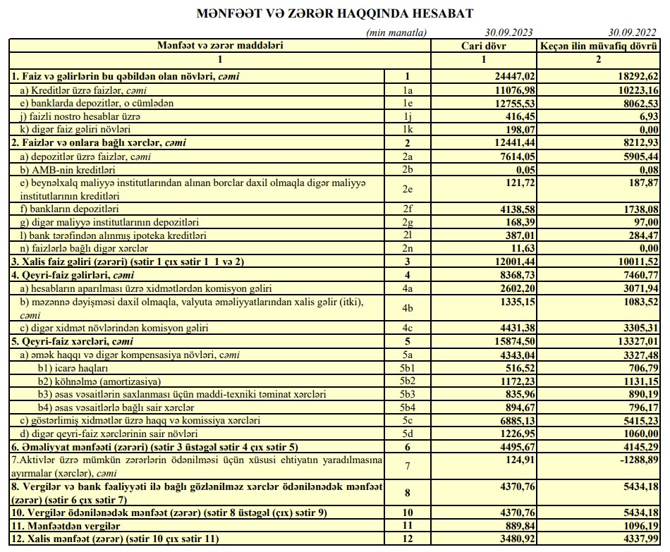 "Azərbaycan Sənaye Bankı" ASC 2023-cü ilin 9 ayını (yanvar-sentyabr) 3 milyon 481 min manat xalis mənfəət ilə başa vurub. Bank ötən ilin eyni dövrünü 4 milyon 338 min manat xalis mənfəət ilə bağlamışdı. Beləliklə, 2023-cü ilin 9 ayı ərzində ötən ilin eyni dövrünün yekunu ilə müqayisədə "Azərbaycan Sənaye Bankı"nın xalis mənfəəti 857 min manat və ya 19,7% azalıb. Xalis mənfəətin azalması bu il mümükün zərərlər üçün yaradılan məqsədli ehtiyatlardan vəsaitin qayıtmaması ilə əlaqədardır. Cari fəaliyyətin nəticəsinin daha dolğun göstəricisi olan əməliyyat mənfəəti artıb.