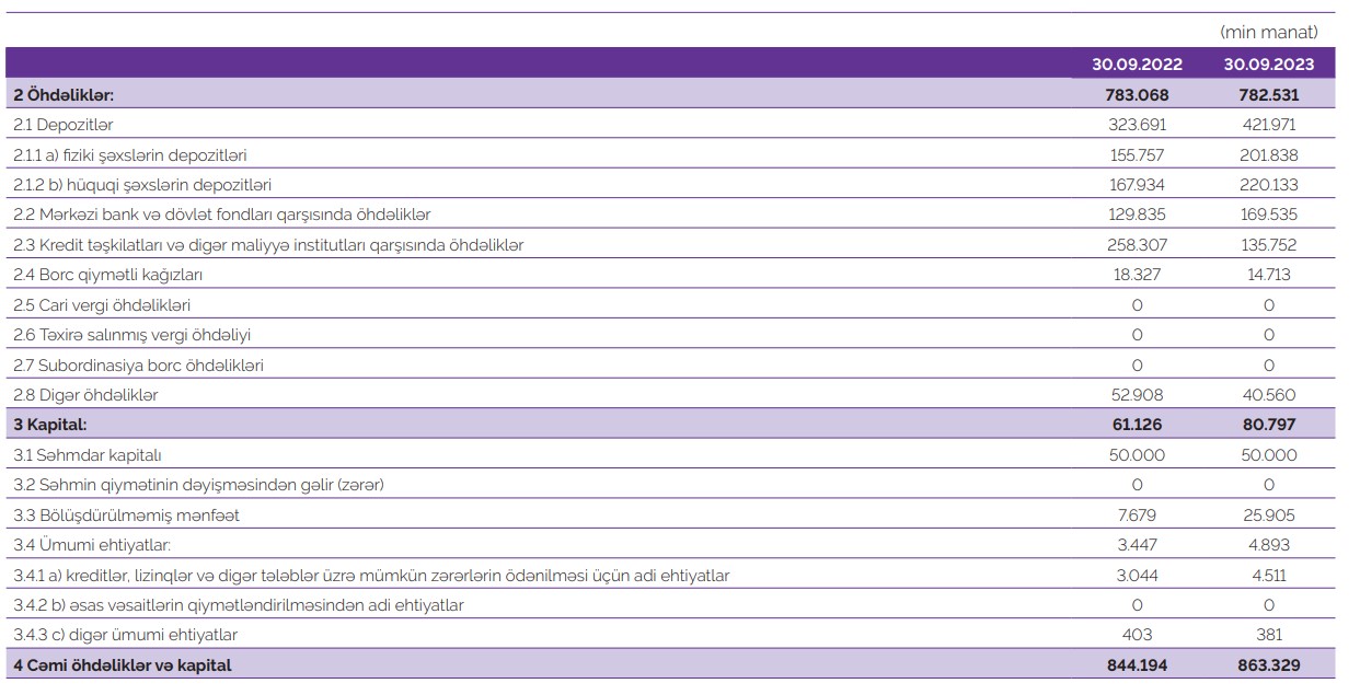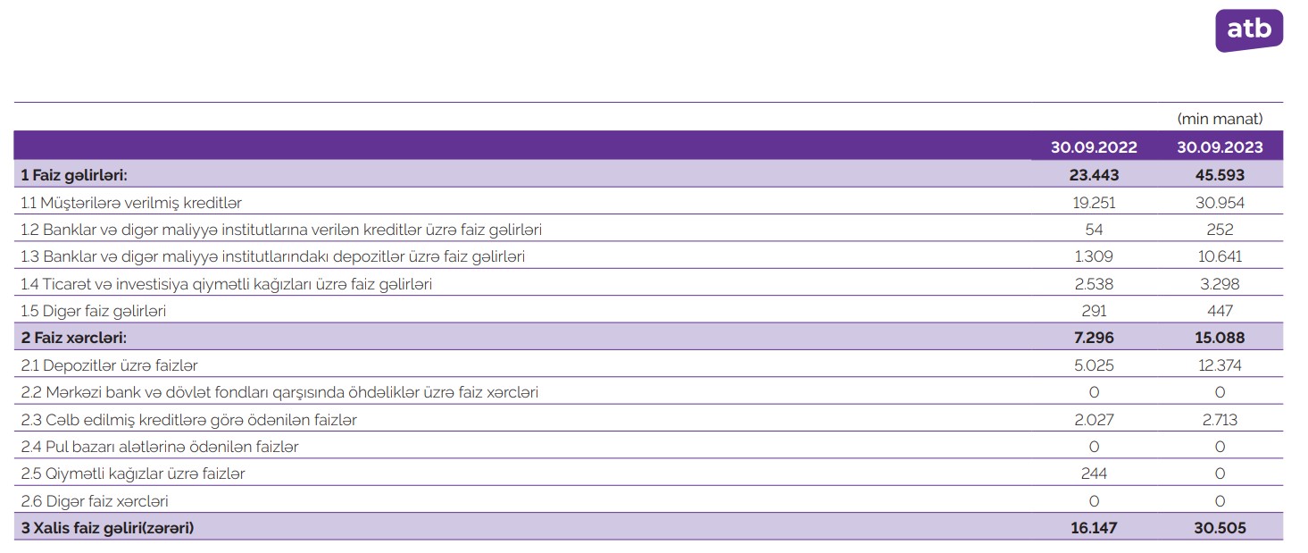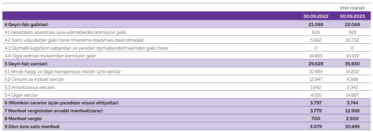 Müqayisə üçün qeyd edək ki, 2022-ci 9 ayında "Azər-Türk Bank"ın cəmi əməliyyat gəlirləri 44 milyon 501 min manat, cəmi əməliyyat xərcləri 36 milyon 925 min manat, əməliyyat mənfəəti 7 milyon 576 min manat, ehtiyatlara ayırma 3 milyon 779 min manat, ödənilmiş mənfəət vergisi 700 min manat olmuşdu.