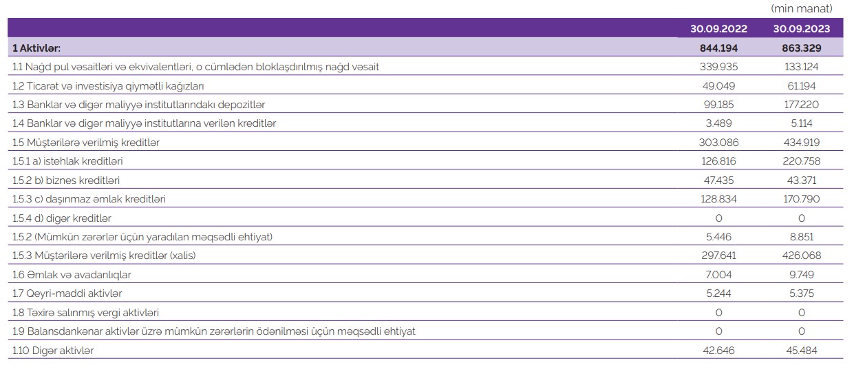 2023-cü ilin 9 ayında 2022-ci ilin 9 ayının yekunu ilə müqayisədə "Azər-Türk Bank"ın cəmi aktivləri 19 milyon 135 min manat və ya 2,3 % artaraq 863 milyon 329 min manata çatıb. Bankın kredit portfeli (müştərilərə verilmiş kreditlər) isə 131 milyon 833 min manat və ya 43,5 % artaraq 434 milyon 919 min manata yüksəlib.