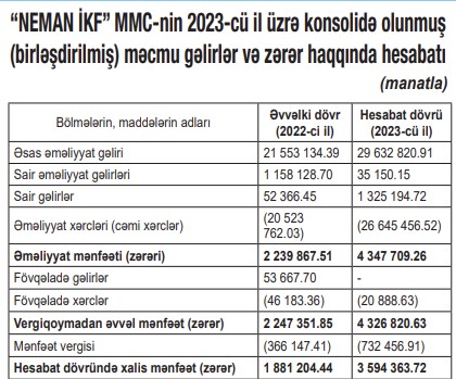 Azərbaycanın qocaman şirkətlərindən biri olan “NEMAN İKF” MMC 2023-cü ili 3 milyon 594 min manat xalis mənfəət ilə başa vurub. Şirkət 2022-ci ili 1 milyon 881 min manat xalis mənfəət ilə bağlamışdı. Beləliklə, “NEMAN İKF” şirkətinin xalis mənfəəti 2023-cü ildə 2022-ci illə müqayisədə 1 milyon 713 min manat və ya 91% artıb.