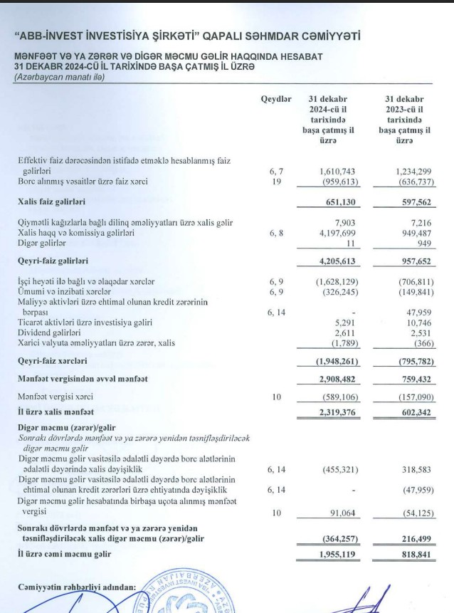 Azərbaycanın ən iri bankı "ABB"yə məxsus "ABB-İnvest İnvestisiya Şirkəti" QSC 2024-cü ili 2 milyon 319 min manat xalis mənfəət ilə başa vurub. Şirkət 2023-cü ili 602 min manat xalis mənfəət ilə bağlamışdı. Beləliklə, "ABB-İnvest"in xalis mənfəəti 2024-cü ildə 2023-cü illə müqayisədə 1 milyon 717 min manat və ya 3,9 dəfə artıb.