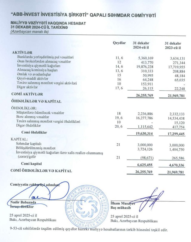 31 dekabr 2024-cü il tarixində "ABB-İnvest" 26 milyon 256 min manat cəmi aktivlərə malik olub. Şirkət 2023-cü ilin sonunda 21 milyon 970 min manat cəmi aktivlərə malik idi. Ötən ilin sonunda "ABB-İnvest"in cəmi aktivlərinin 75,7%-ni investisiya qiymətli kağızları, 20,4%-ni banklarda yerləşdirilmiş pul vəsaitləri təşkil edib.