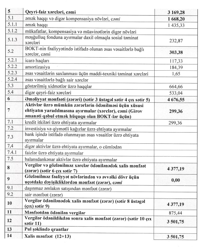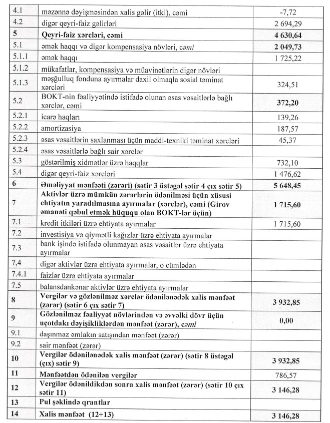 BOKTEmbafinans maliyyə nəticələri xalis mənfəət gəlir azalması faiz gəlirləri qeyri-faiz gəlirləri xüsusi ehtiyat kredit portfeli gecikmədə olan kreditlər aktivlər üzrə zərərlər maliyyə ehtiyatı əməliyyat mənfəəti nizamnamə kapitalı Elşad Abbasov Tamara Başirovna maliyyə hesabatı kredit təşkilatı
