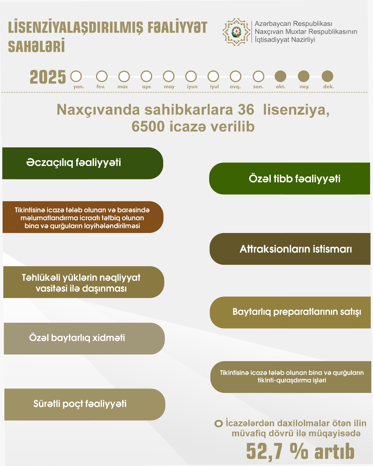 Naxçıvan Muxtar Respublikası İqtisadiyyat Nazirliyindən verilən məlumata görə,verilmiş lisenziyalar əczaçılıq, özəl tibb, tikintisinə icazə tələb olunan və barəsində məlumatlandırma icraatı tətbiq olunan bina və qurğuların layihələndirilməsi, attraksionların istismarı, təhlükəli yüklərin nəqliyyat vasitəsilə daşınması, baytarlıq preparatlarının satışı, özəl baytarlıq xidməti, tikintisinə icazə tələb olunan bina və qurğuların tikinti-quraşdırma işləri, sürətli poçt fəaliyyəti üzrə sahələri əhatə edib.