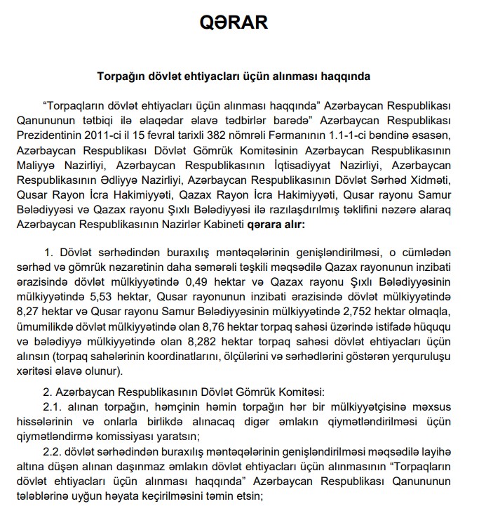 Qərara əsasən, dövlət sərhədindən buraxılış məntəqələrinin genişləndirilməsi, o cümlədən sərhəd-gömrük nəzarətinin daha səmərəli təşkili məqsədilə Qazax rayonunun inzibati ərazisində dövlət mülkiyyətində 0,49 hektar və Qazax rayonu Şıxlı Bələdiyyəsinin mülkiyyətində 5,53 hektar, Qusar rayonunun inzibati ərazisində dövlət mülkiyyətində 8,27 hektar və Qusar rayonu Samur Bələdiyyəsinin mülkiyyətində 2,75 hektar olmaqla, ümumilikdə dövlət mülkiyyətində olan 8,76 hektar torpaq sahəsi üzərində istifadə hüququ və bələdiyyə mülkiyyətində olan 8,28 hektar torpaq sahəsi dövlət ehtiyacları üçün alınacaq.